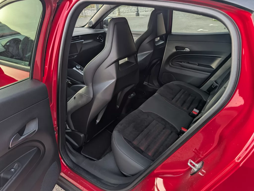À l’avant, les sièges baquets Sabelt en Alcantara inclus dans le Pack Sport offrent un maintien remarquable, au prix toutefois d’une assise étroite pour les gabarits imposants. L’habitacle, élégant mais entaché de plastiques durs, se rattrape grâce à de petites attentions, comme le tunnel central rembourré permettant de caler confortablement son genou.