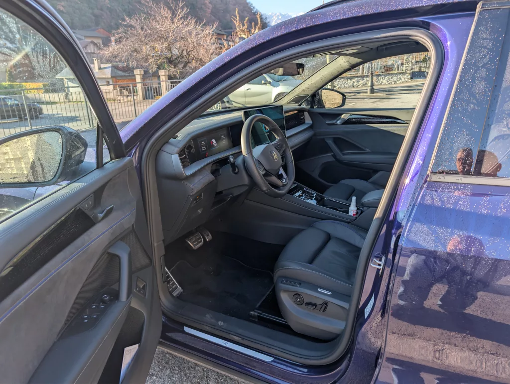 Sans surprise, le Tayron reprend des interfaces déjà connues. L’instrumentation numérique de 10,25 pouces se montre très lisible et personnalisable, avec la possibilité d’afficher la navigation afin de limiter les distractions. L’écran tactile central, proposé en 12,9 ou 15 pouces, offre une excellente définition, une réactivité convaincante et des raccourcis configurables pour accéder rapidement aux fonctions essentielles — notamment pour désactiver certaines aides à la conduite jugées trop intrusives.