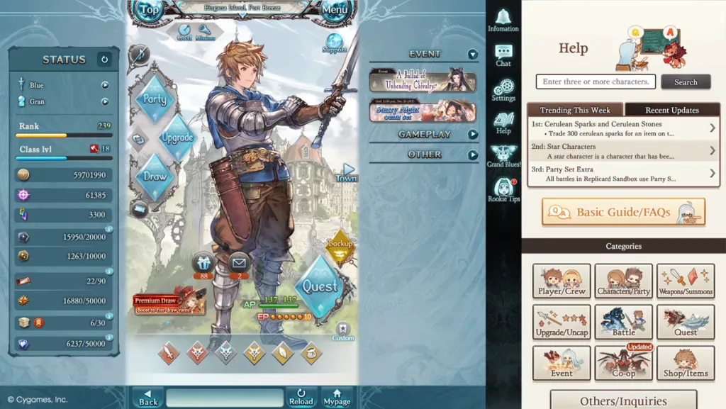 Granblue Fantasy est un RPG sorti initialement en 2014 sur le marché japonais, actuellement accessible via l’App Store, Google Play, AndApp et la plupart des principaux navigateurs web. Les joueurs y incarnent des navigateurs, de courageux aventuriers qui embarquent à bord de vaisseaux aériens pour voyager à travers un royaume d’îles flottantes. Ils y découvriront un système de combat au tour par tour composé de fonctionnalités telles que des compétences, des attaques liées, des chain bursts et des affinités élémentaires, ainsi que des animations d’attaques liées et d’invocations spectaculaires. Une multitude de raids coopératifs permettront aux navigateurs de s’allier en temps réel, tout en profitant de plus de 70 classes de job et de systèmes de personnages et d’armes complexes offrant aux joueurs d’innombrables façons de personnaliser leur style de jeu. Autre point fort du titre : sa riche bibliothèque d’histoires. De la quête principale aux événements scénarisés, en passant par les épisodes Fate centrés sur les personnages… Les joueurs ne manqueront pas de nouvelles aventures dans lesquelles se plonger. Ils pourront également faire la rencontre de personnages attachants, profiter d’histoires entièrement doublées ou former le plus puissant des équipages dans les cieux infinis et enchanteurs de Granblue Fantasy.